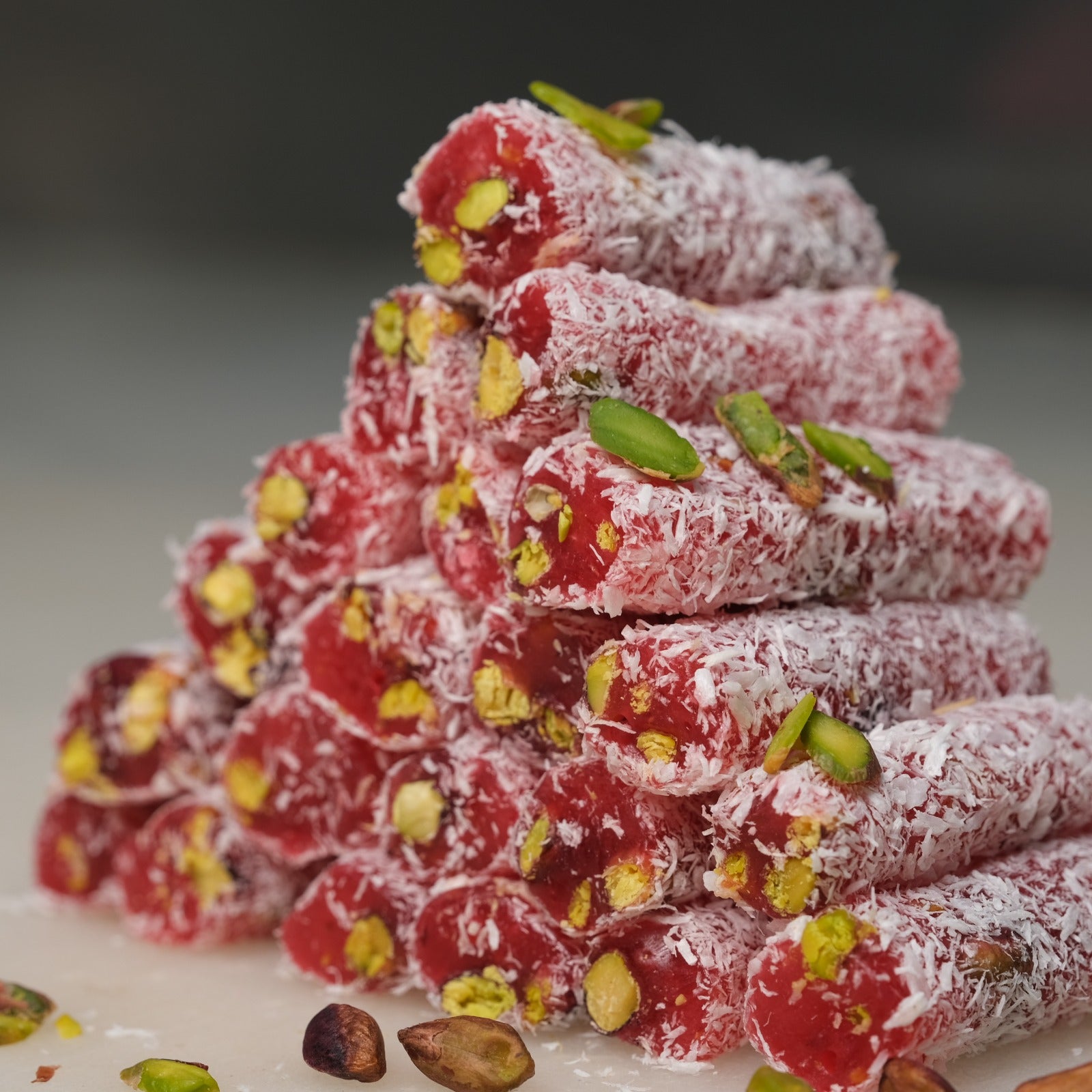 Nar fıstıklı hindistan cevizi kaplı parmak lokum, uzun yıllardan beri kullanılan tarihi formülü ile özenle hazırlandı. Geleneksel bakır kazanlarda doğal içeriklerle üretilmektedir. Doğal şeker pancarının en doğal haliyle lokumun buluşmasını çok seveceksiniz. Ürünlerimizde kesinlikle glikoz şurubu kullanılmamaktadır.